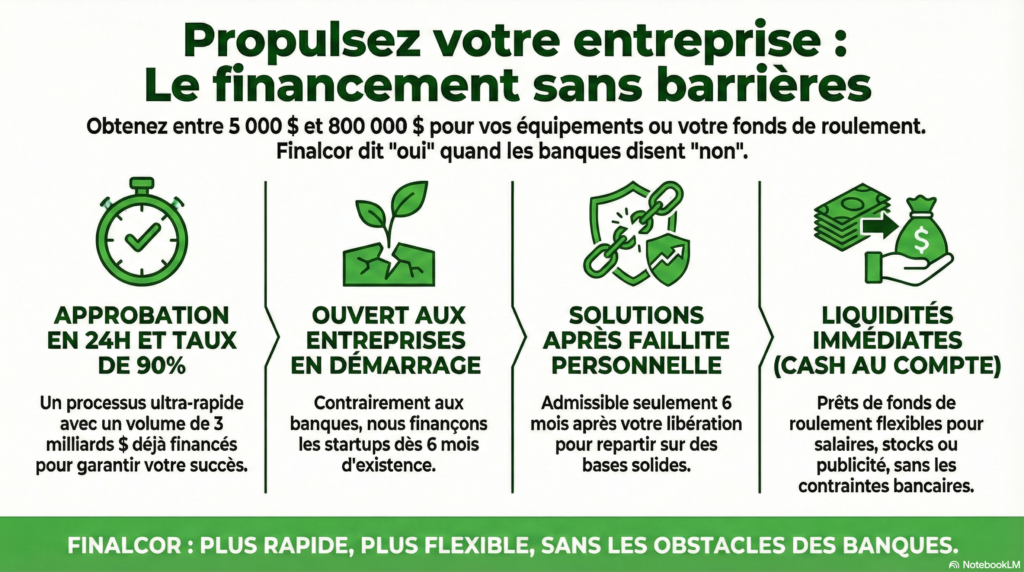 Un courtier en financement peut être un partenaire précieux dans votre recherche de financement. Contrairement à une seule banque, les courtiers comparent plusieurs institutions et produits afin de trouver les solutions les plus avantageuses pour votre entreprise. Ils peuvent également anticiper les obstacles, mettre en avant les points forts de votre demande et vous guider tout au long du processus, ce qui vous permet de gagner du temps et de réduire votre stress.